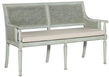 A fresh take on a vintage design, the charming Charleston bench is crafted of wood and accented by cane on the back and inside and outside arms. Featuring intricately-shaped legs, the piece is finished in Haint Blue, the cushion is upholstered in the Oyster performance fabric for stain resistance and cleanability.Read More