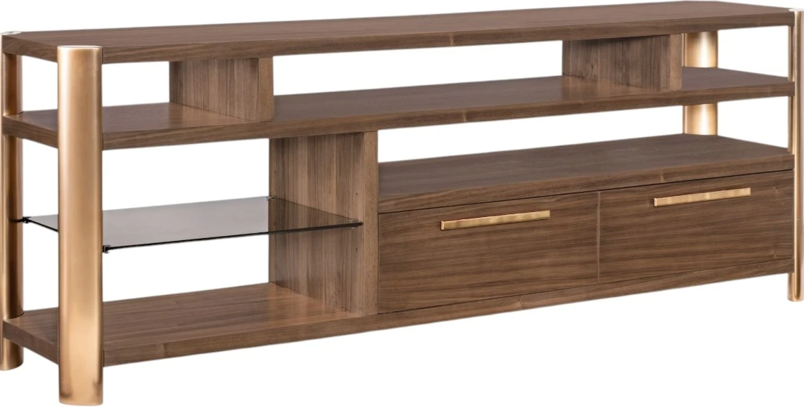 Redefine your media space with the Eleana entertainment console, designed with light caramel walnut veneers, plated metal legs, and solar-bronze tinted glass shelving. Featuring wire management channels, two self-closing drawers, and adjustable shelving, it’s as practical as it is sophisticated.Read More