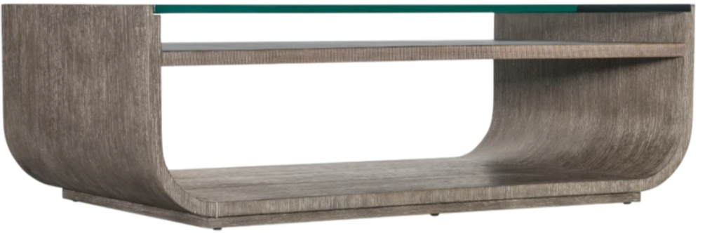 Architectural and timeless with a luxe mixture of materials, the striking Modern Mood rectangle cocktail table has a raffia-wrapped shelf beneath a one-inch-thick tempered glass top. With rounded sides, the table is crafted of oak veneers with tactile wire-brush detailing in a dark mink finish with dark, earthy brown hues with notes of black, offering soft sophistication.Read More