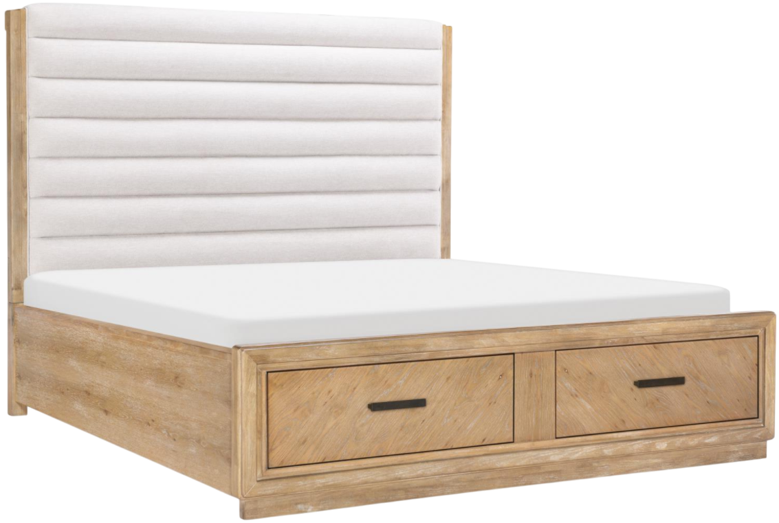 Elevate your bedroom with the Legacy Classic Torrance queen channeled upholstered panel storage bed in aged driftwood—a fusion of coastal casual elegance and functional design. Bathed in a warm, organic aged driftwood finish.Read More