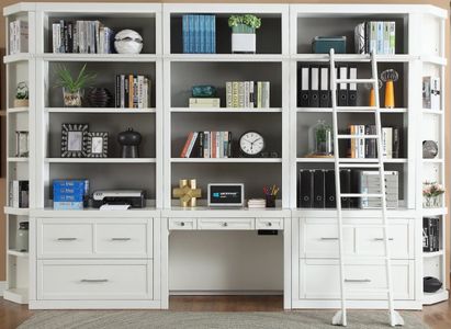 Creating the appearance of built-in cabinets is easier than ever with this modular collection. Not only does this arrangement boast plenty of library storage and shelf space for your home office, but it also features file storage and a workspace desk. The adjustable ladder glides smoothly on the joined ladder rails, access to the upper shelves.Read More