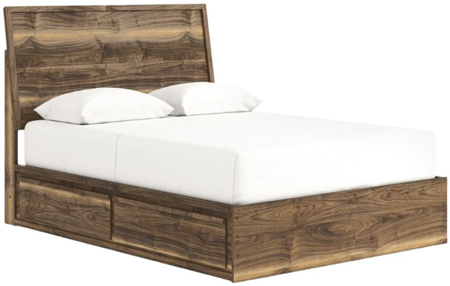 Nostalgic style, retooled for today’s trends. This queen panel bed with storage puts an elevated twist on mod aesthetics. Its warm brown tones reflect the mid-century vibes you love, while the simple panel design incorporates contemporary motifs. Ultra-spacious storage in the footboard keeps clutter out of sight. Integrated drawer handles round out the look in sleek style.Read More