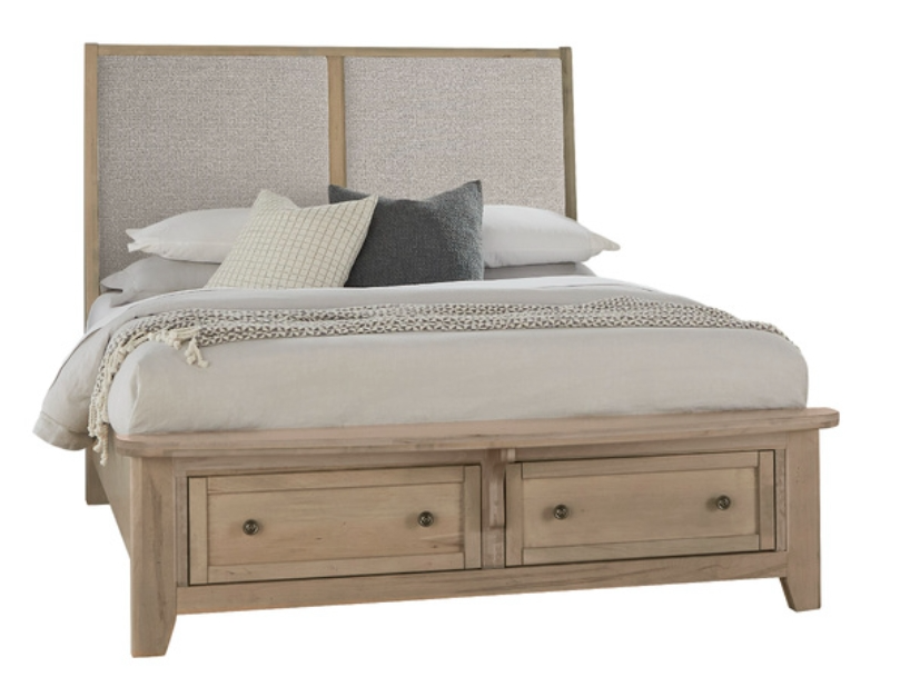 Upholstered bed with footboard storage boast a refined classic look that will stand the test of time. Styled with simple lines; the canted headboard is slightly angled for comfort. Two drawers in the footboard of the bed offer up plenty of convenient storage for extra bedding.Read More